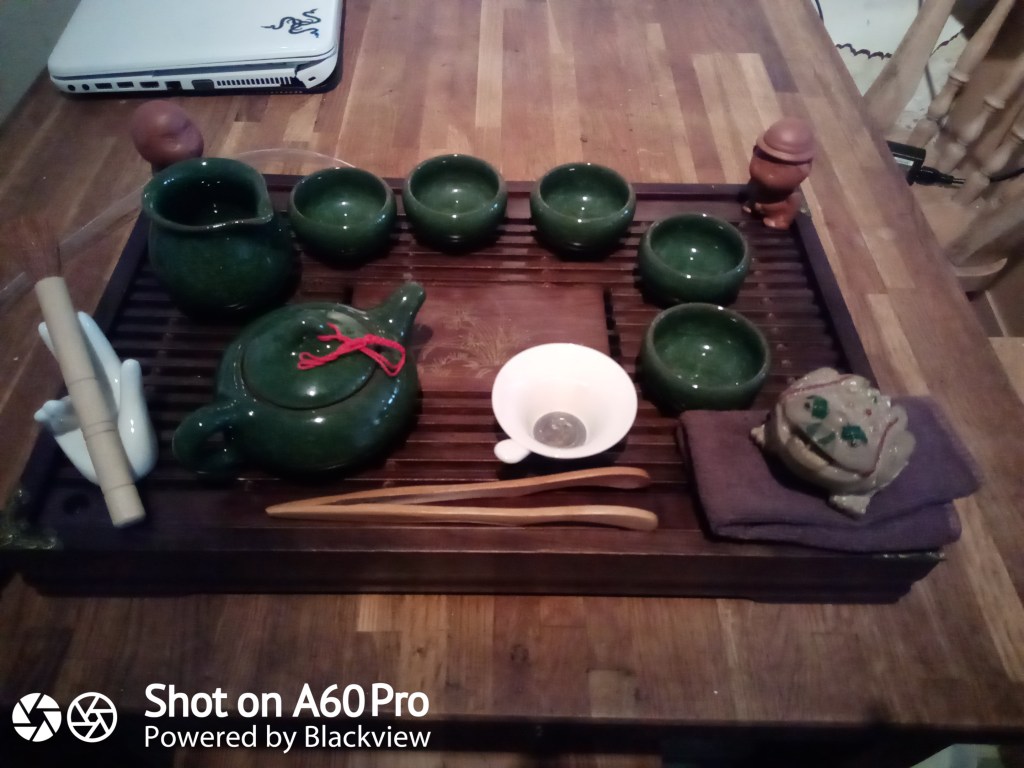 Plus, the second person to message will get a gorgeous tea set! Deep green, with a wooden platform to hold the set on. Teapot, milk jug, and five tea cups, as well as a brush for the leaves, a holder, a filter, a pump for steam, and cute good-luck figurines!